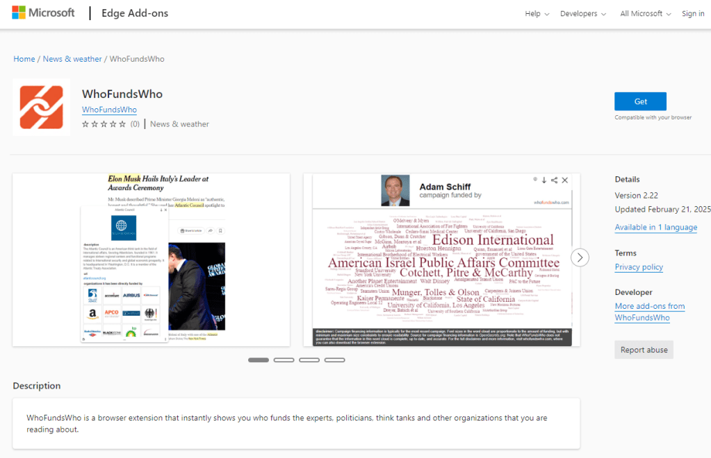 You can also install WhoFundsWho as a Microsoft Edge add-on via the Microsoft Edge Add-on store.